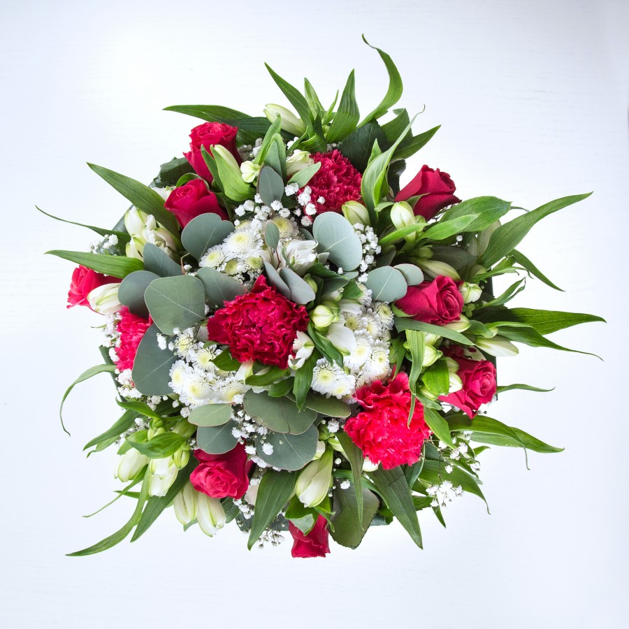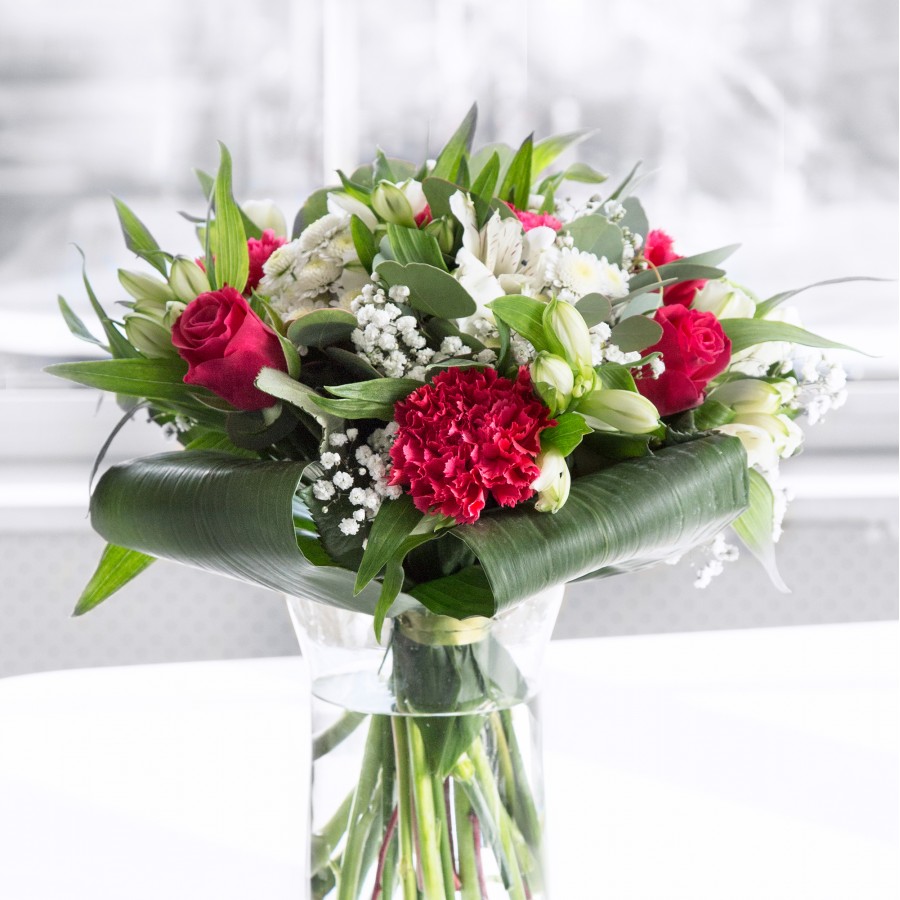 Mark every special moment with our elegant celebration bouquet, thoughtfully designed to impress and delight. This arrangement brings together the timeless beauty of red roses with the gentle grace of white chrysanthemums. Enhanced by the airy texture of gypsophila and the tender charm of carnations, the bouquet is perfectly rounded out with white alstroemeria and stylish aspidistra leaves.